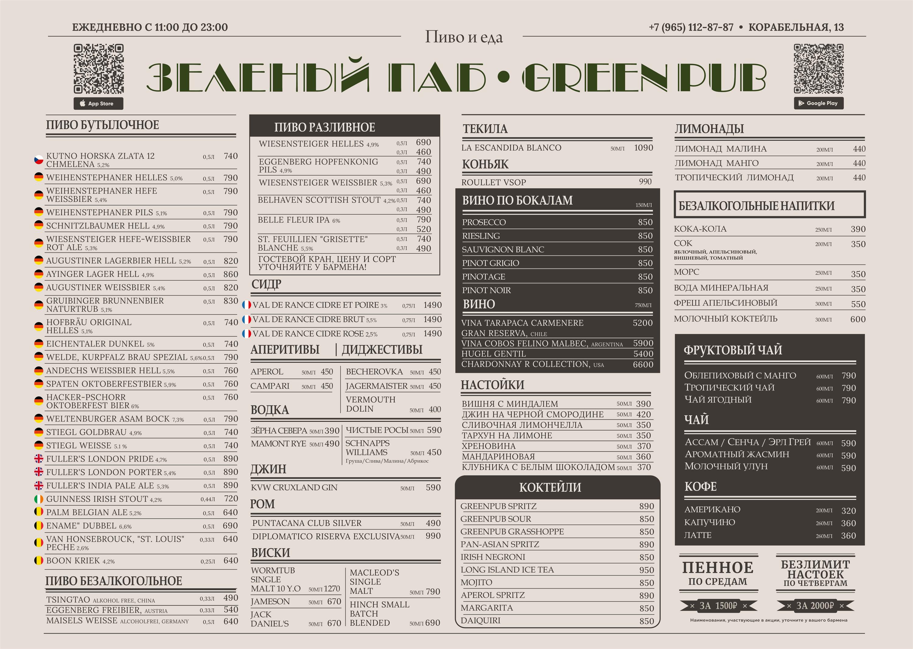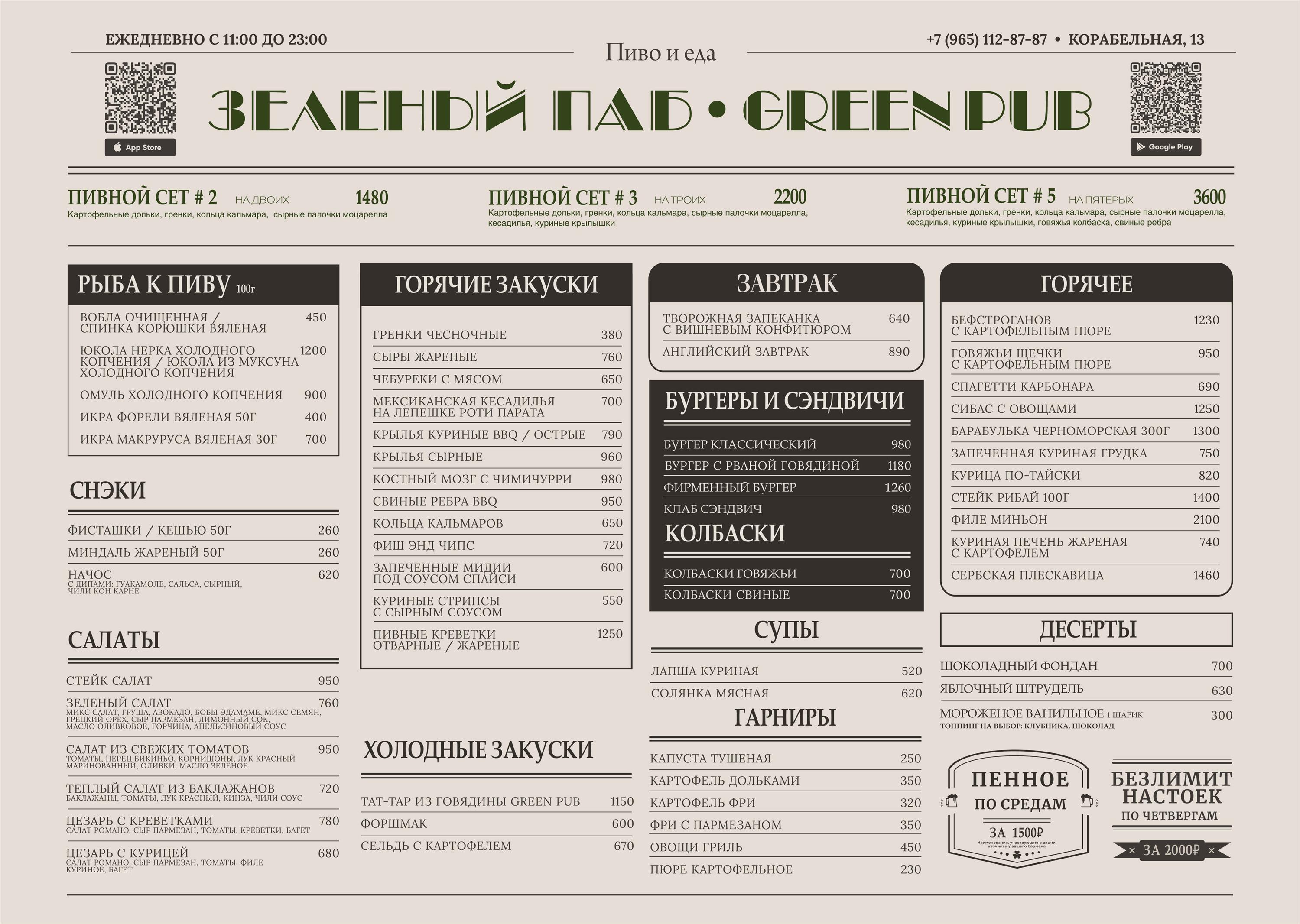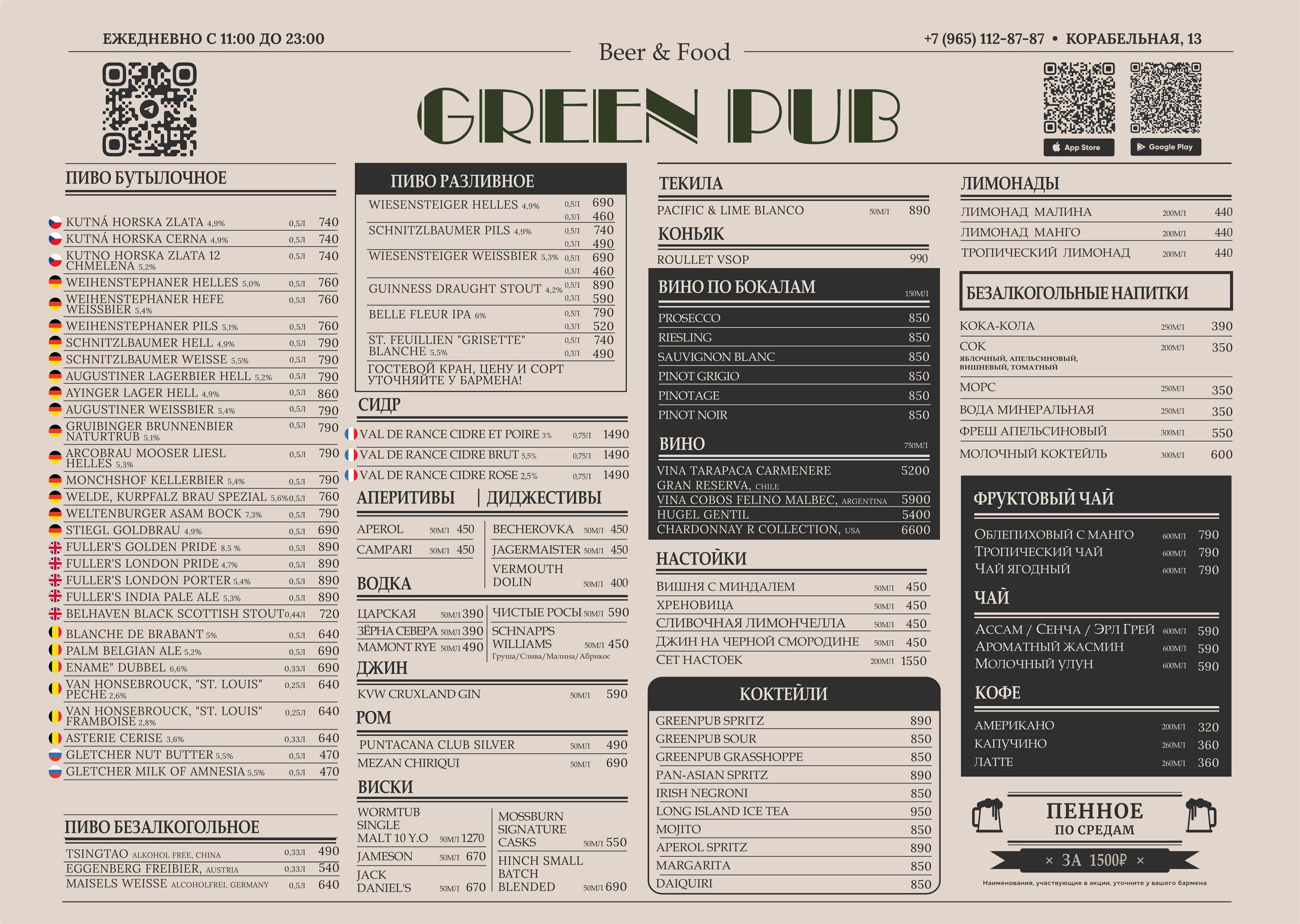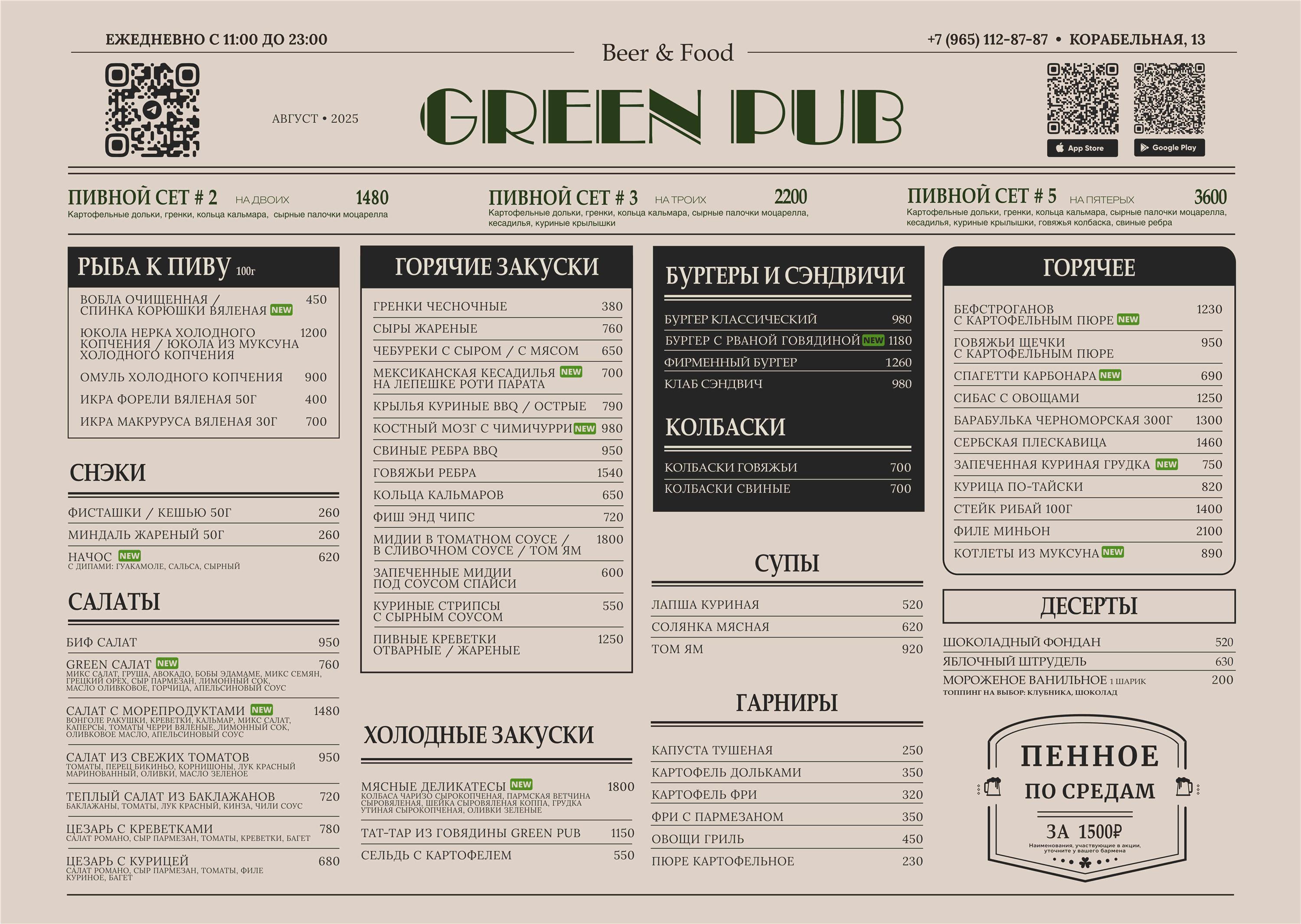 Меню GREEN PUB создано для того, чтобы собрать вместе самых разных гостей. Здесь каждый найдет свое идеальное блюдо: от сочных стейков и авторских бургеров до легких салатов и морских деликатесов.