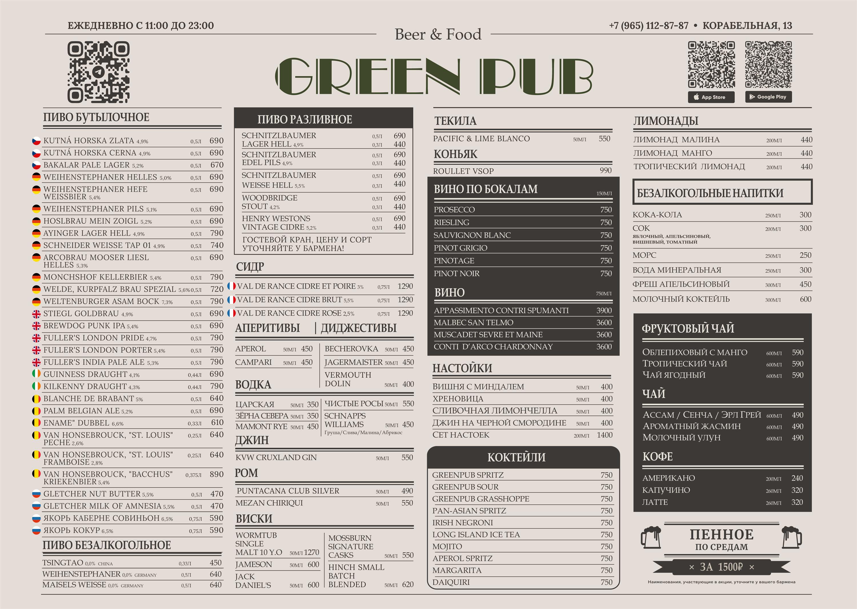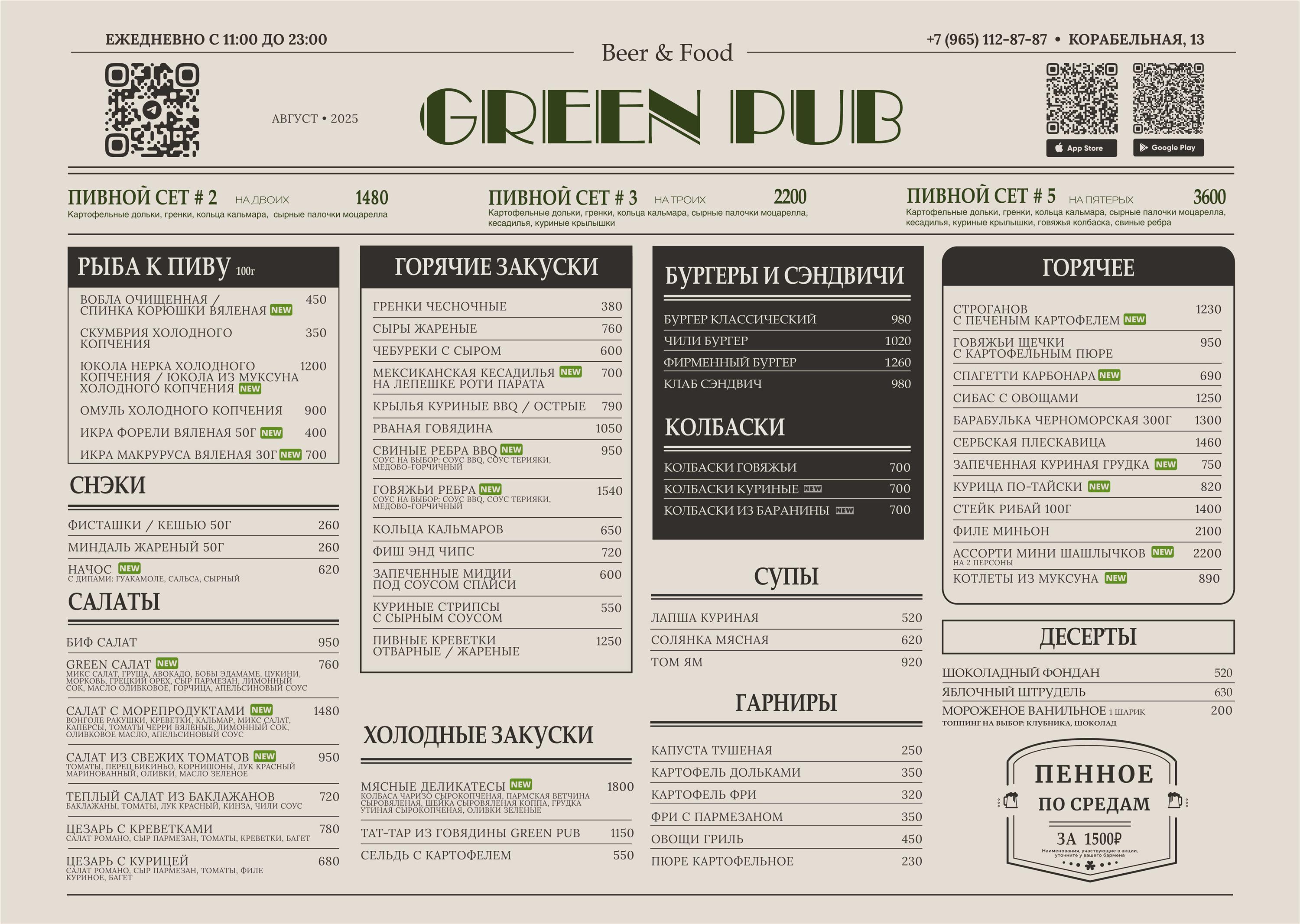 Меню GREEN PUB создано для того, чтобы собрать вместе самых разных гостей. Здесь каждый найдет свое идеальное блюдо: от сочных стейков и авторских бургеров до легких салатов и морских деликатесов.